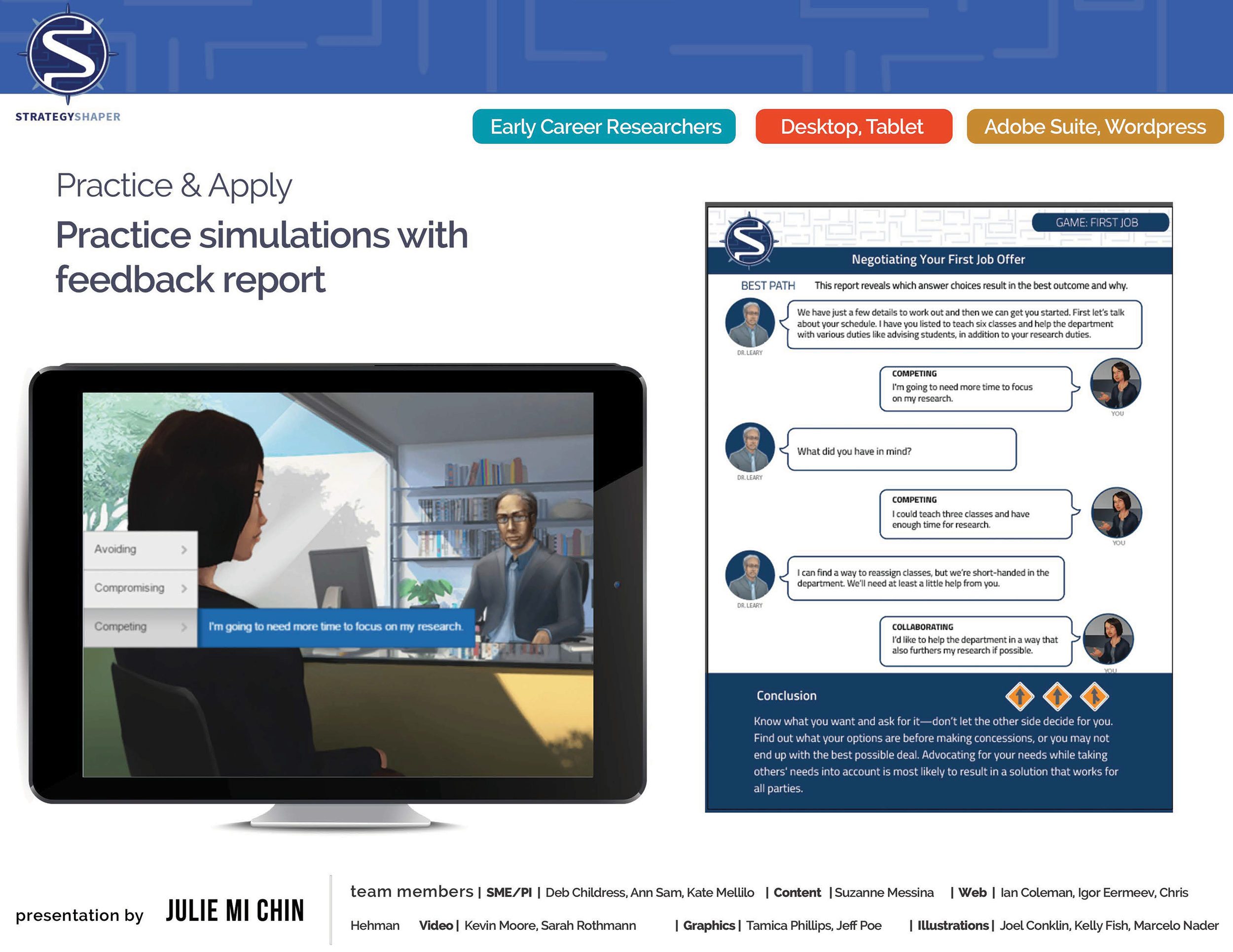 I collaborated with an interdisciplinary team at 3C Institute to work with Andrea Schneider and Dr. Kipfer to curate a personalized, interactive online course that gives researchers the critical negotiation skills they need to have a successful career. As art director, I led the team of animators and videographers to create didactic videos, interactive quizzes, and simulated conversation games and coordinated with the content and web development team.